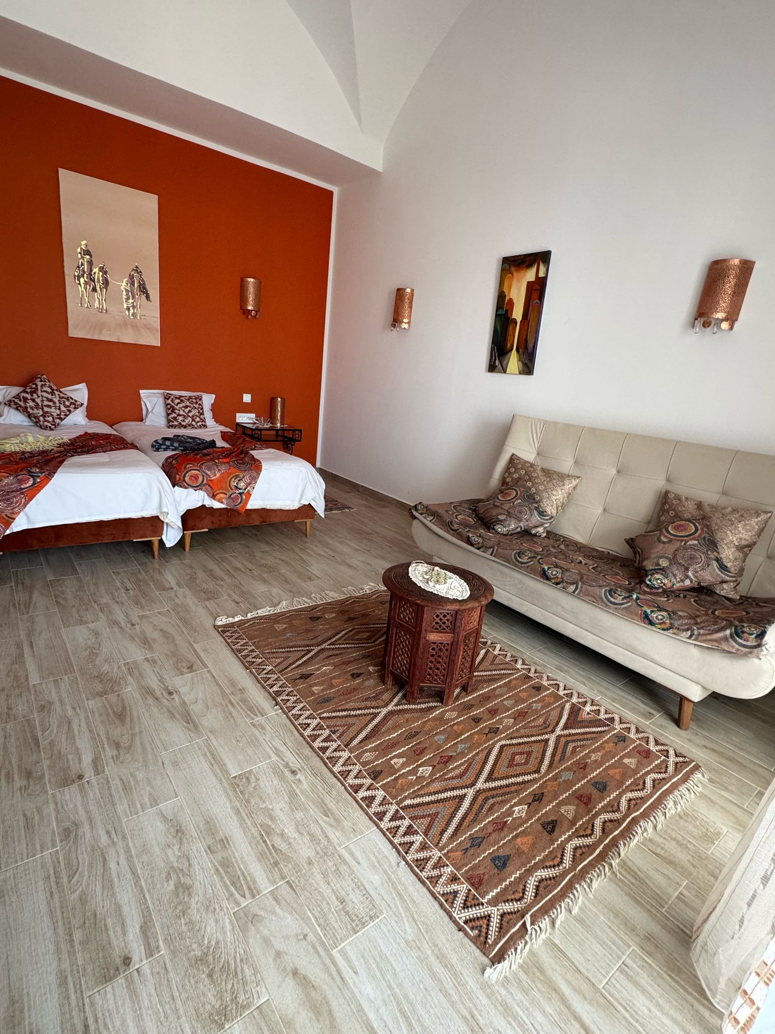 La Suite Sahara dispose de deux lits single et d'un clic clac, d'un coin salon et d'une salle de bains privative. La suite dispose également d'un balcon avec vue sur la pîscine.